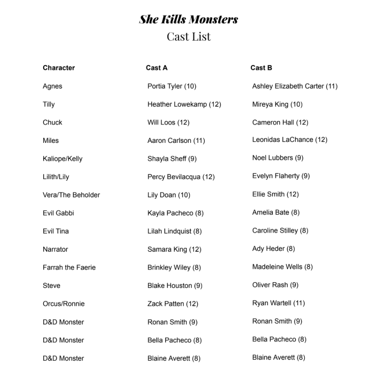 This show will be performed with two separate casts performing a total of four performances. Cast A will perform on Thursday and Saturday at 7:00 pm, and Cast B will perform on Friday at 7:00 pm and Sunday at 2:00 pm. See the cast list below to make sure you can go see your friends on a night they have a major role, although almost everyone will be on stage for all four performances, regardless of their cast. Remember, all upper school students can attend any night for free!